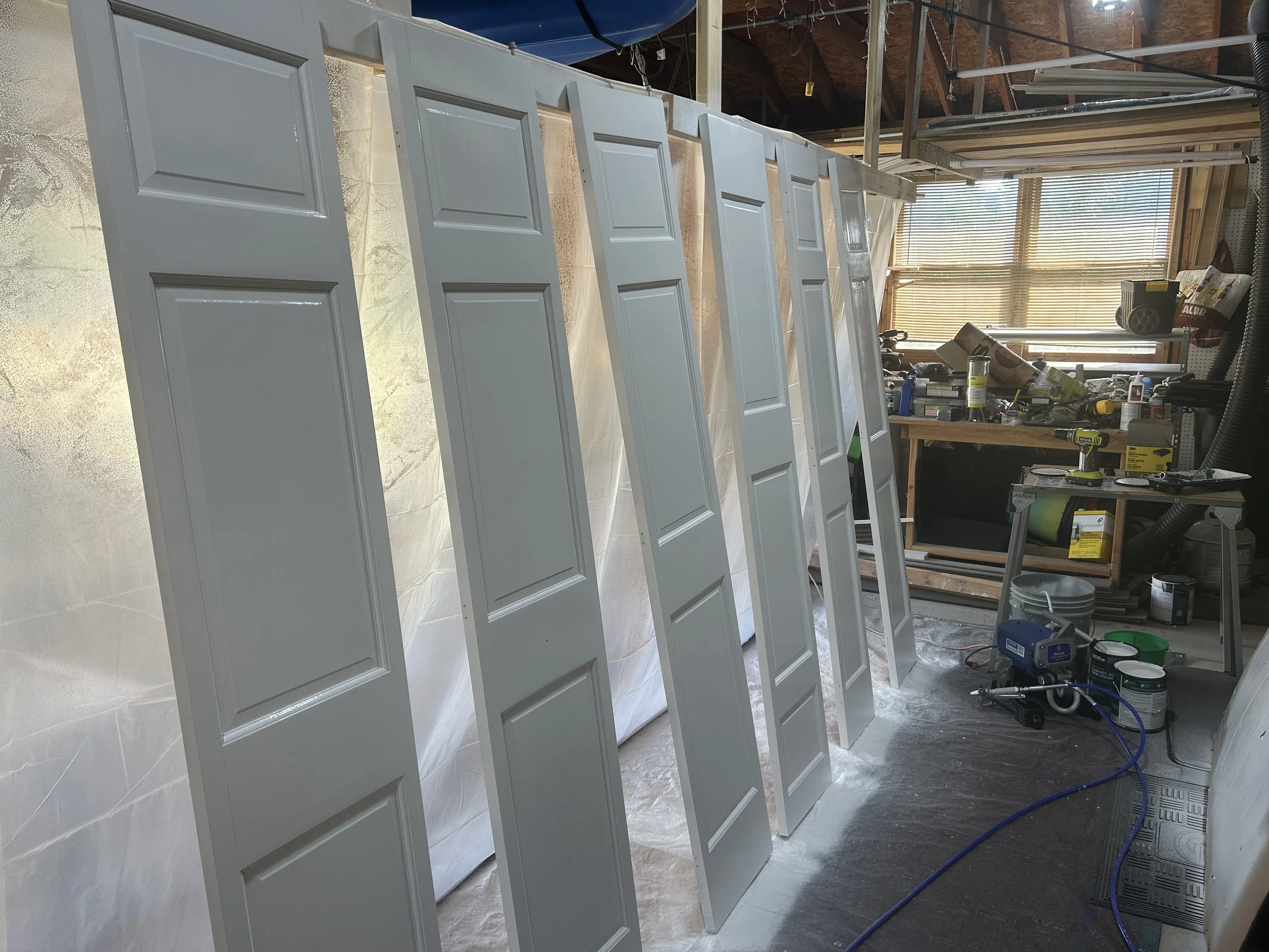 The Door Refinishing Project After coming in and replacing the baseboards in this clients home, they decided they wanted to update their six-panel solid doors to match the modern look. Along with all new casing and custom headers for each doorway.